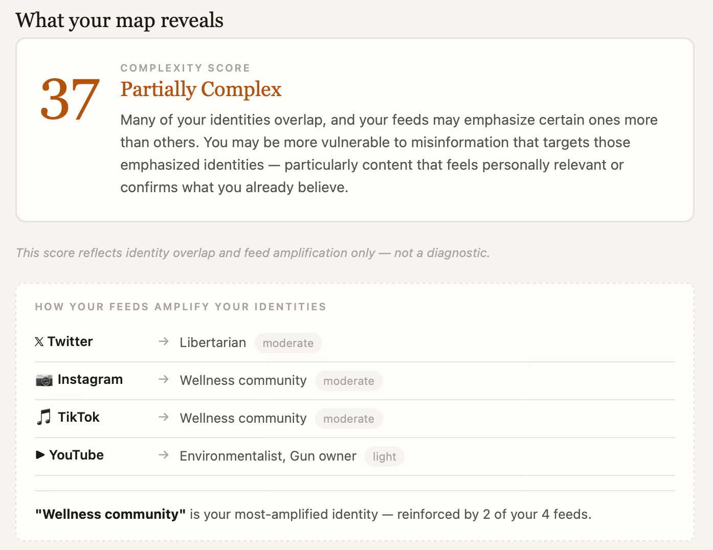 At the end, you’ll get a Complexity Score and three reflection questions designed to help you think critically about your identity profile and your information environment.